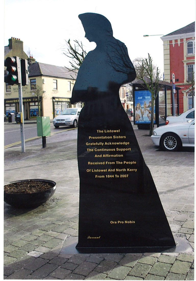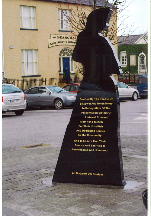 The profile of the nun stands at 8 feet and is cut from black granite. She stands outside the church, overlooking the square. The first Presentation Sisters Order arrived in Listowel in 1844, beginning a relationship with the town that was to last 163 years until the convent closed in 2007. The statue stands as a memorial to the order’s contribution to education and social care in the town.